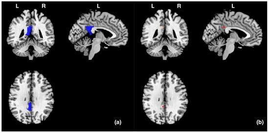 (a) The blue areas represent the ROI (the left PCgG) in this study, and the size was 3704 mm3 (463 voxels). (b) The red areas represent the areas (−4, −44, 32) in the left posterior cingulate gyrus that were significantly activated during picture observation compared to during positive imagery generation. L and R indicate left and right hemispheres, respectively.
