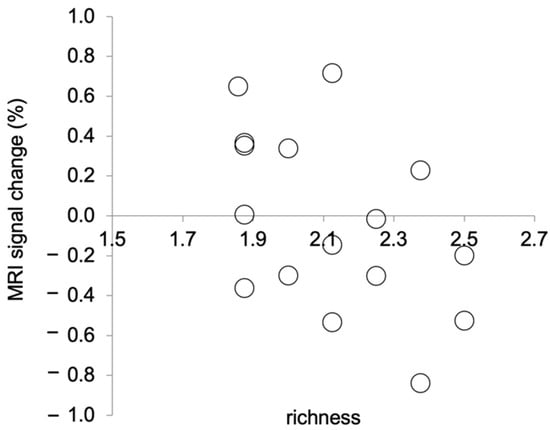We calculated the mean changes in the MRI signal as follows: First, we calculated the MRI signals in the brain area examined in this study using Marsbar. Then, we calculated the changes in the MRI signal during picture observation relative to those during relaxation. Relaxation in the baseline condition lasted for 20 s before the picture observation, which also lasted for 20 s. We calculated changes in the MRI signal during picture observation in the picture observation condition relative to those during relaxation in the most recent baseline condition. In this experiment, the TR duration was 3 s. Thus, the MRI signal data were recorded 6–7 times each during relaxation and during picture observation. The data from only six scans from the beginning to the end of an activity were analysed. These six scans were averaged for each activity. The MRI signal change was then calculated for the averaged MRI signal during picture observation relative to that during relaxation. The mean percentage change in the MRI signal and the mean richness score for the picture observation condition were calculated for each participant. That is, the following means were calculated for each participant across the eight picture observation trials: percentage change in the MRI signal and richness score. Shapiro–Wilk tests were performed on the mean percentage change in the MRI signal and the mean richness scores to test for normality. As a result, Spearman’s rank correlation was calculated, as the mean richness scores were not normally distributed (p = 0.06). There was a significant negative correlation between the mean percentage change in the MRI signal and the mean richness score (rs (14) = −0.50, p = 0.047, two tails, Figure 3). This result indicates that the stronger the activation of the brain area in the left PCgG, the clearer the recognition of the presented picture.
