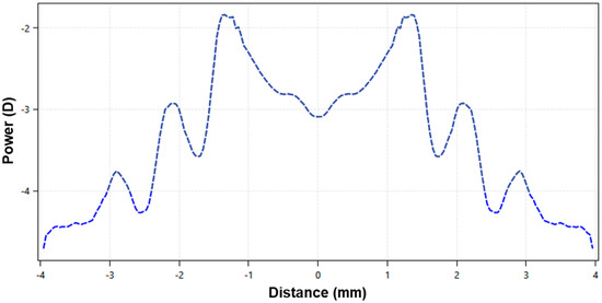 The EDOF lens has a non-monotonic and aperiodic power profile across the optic zone, with smooth transitions between the multiple zones (Figure 1). The lens design incorporates high-order aberration, especially spherical aberration, to achieve a through-focus up to +1.75 D from the distance refraction (Figure 1). This provides good optical quality within a single-elongated focal point anterior to the retina while rendering the optical quality of the image points posterior to the retina poorer [9,13].