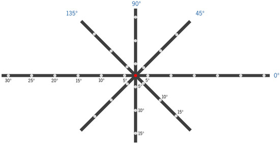 On- and off-axis objective refraction were measured with the two CLs, using a WAM-5500 auto-refractometer/keratometer (GrandSeiko Co., Ltd., Hiroshima, Japan). Measurements were performed using a fixation cross with LED lights at 2.5 m from the observers, whose location corresponded to retinal eccentricities in steps of 5°. Measurements were obtained for the horizontal (from 5 to 30° nasal, center, and from 5 to 30° temporal), vertical (from 5 to 15° superior and from 5 to 15° inferior) and oblique meridians at 45°, 135°, 225° and 315° (from 5 to 15°), as represented in Figure 2. These points were converted and analyzed according to the nasal (N), temporal (T), superior (S), inferior (I), superior–nasal (SN), superior–temporal (ST), inferior–nasal (IN) and inferior–temporal (IT) projections into retinal eccentricities. The subjects would initially place their forehead and chin in the corresponding rest places, aligned with the central point (center, 0° eccentricity, red spot in Figure 2), and look to each point according to the researcher’s needs without moving their heads. The auto-refractometer took five quick automatic measures of the sphere, cylinder (in steps of 0.01 D) and axis (in steps of 1 degree). The average of the five values was automatically recorded in an Excel sheet (Microsoft® Office Proofing Tools, 2018 Microsoft Corporation, Los Angeles, CA, USA) using software directly connected to the auto-refractometer. A pupil diameter >4 mm is required for off-axis measurements with the GrandSeiko auto-refractometer. The room illumination allowed us to achieve this requirement in all subjects.