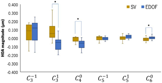 Figure 4 shows the HOAs measured with the SV and EDOF lenses on, represented in boxplots. The EDOF lens significantly changed the third-order horizontal coma () and the fourth-order () and sixth-order () spherical-like (SA) HOAs compared to the SV. The EDOF lens induced a median negative increase of 0.138 [0.012] µm in (p = 0.001) and of 0.076 [0.005] µm in (p = 0.002) compared to the SV. The median difference in between the EDOF and the SV was 0.018 [0.001] µm (p = 0.009). The total HOA RMS (not represented) did not show statistically significant differences between the two CLs.