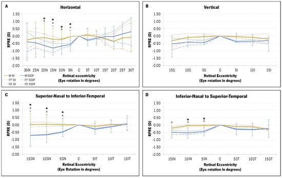 Mean relative refractive peripheral refractive error (RPRE) profile, in diopters (D), of the three components of refraction (M, FT′ and FS′) with the single-vision (SV, in light-brown) and the extended-depth-of-focus (EDOF, in blue) contact lenses for four retinal meridians: horizontal (A), vertical (B), superior–nasal (SN) to inferior–temporal (IT) (C) and inferior–nasal (IN) to superior–temporal (ST) (D). The M component is represented by a full line and darker colors, while FT′ and FS′ are represented in light colors (long-dashed lines and short-dashed lines, respectively). (*) statistically significant differences from the post hoc Bonferroni pairwise comparison between the two contact lenses at each point for the M component (black asterisk), FT′ (dark-gray asterisk) and FS′ (light-gray asterisk).