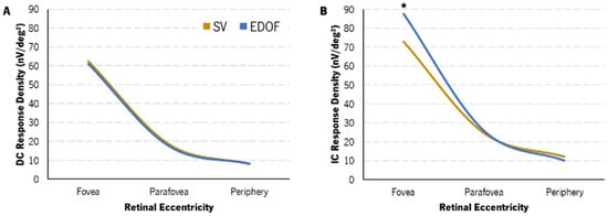 Change in DC (A) and IC (B) response density with eccentricity with SV (light-brown) and EDOF (blue) contact lenses. Variance and IQR are not represented for clarity. EDOF showed a statistically significantly higher IC response density in the fovea compared to SV (*).