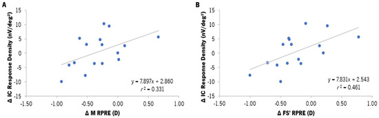 The analysis of the correlation between the changes in the RPRE and the changes in the response densities of the gf-mfERG response was conducted by Spearman’s correlation. The variation in the response density of the IC component in the para-macula showed statistically significant correlations with the M (r = 0.575, p = 0.025) and FS′ (r = 0.679, p = 0.005) components of the para-macula (Figure 7A and Figure 7B, respectively). Nevertheless, as shown in Figure 7, this correlation was limited by the amount of data and had a moderate dispersion.