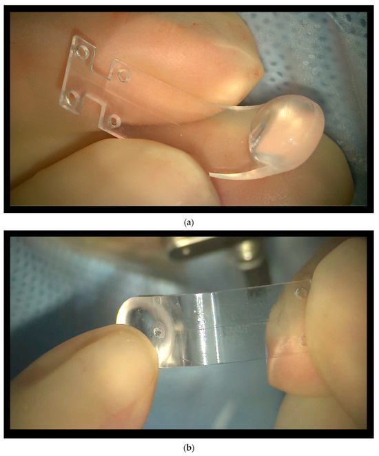 - Position Check. The position of the NPB is checked through the microscope by moving the NPB with the NPB loading device or with strong forceps (Figure 10a,b). If the location is correct, the surgeon can go to step 8; otherwise, the sutures should be adjusted until the buckle is well centered.