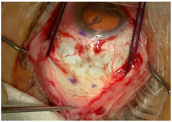 - The sclera in the superotemporal quadrant is freed from bleeding vessels by applying spot diathermy to obtain a clean surface on which to place the NPB.