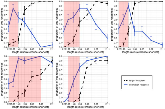 For each subject, there is a clear range of length ratio values where the proportion of ‘yes’ responses to the question "Did you see an orientation change?" is significantly higher than the proportion of ‘yes’ responses to the question "Did you see a length change?". The red-shaded regions on the plot in Figure 4 represent regions where the proportion of ‘yes’ responses in the first block is higher than the proportion of ‘yes’ responses in the second block and where the standard errors do not overlap. We observe that even at substantial levels of length change, some subjects reported seeing an orientation change instead.