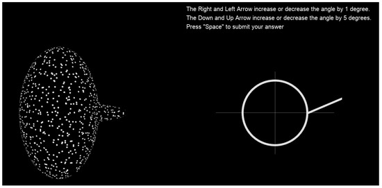 To report the perceived horizontal angle, subjects were asked to make adjustments to a schematic figure. The figure, as seen on the right side of Figure 4, was a white circle with a protruding white line part. The schematic represents the view of the 3D object from the top: the circle represents the main body, while the line represents the protruding part. The diameter of the circle was 2.14°, while the line was 2.35° long. Subjects adjusted the orientation of the white line in the adjustment display to match the perceived horizontal orientation of the part relative to the main body in the random-dot display (see below for details).