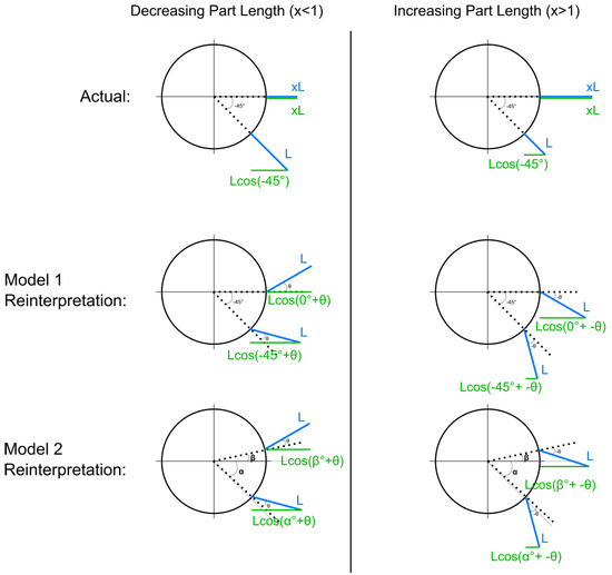 The two schematics in the middle row of Figure 5 show the projected lengths of the part under the reinterpretation of the part having a fixed horizontal angle with no length change. In both schematics, the length of the part (represented by the blue line) stays fixed from −45° to 0°. On the left, in the decreasing-length case, the part is perceived to be angled away from the observer. We use to represent the perceived part angle. The solid green lines represent the part’s projected lengths in the image plane. The projected length changes in the image plane for the actual length change (the two schematics in the top row) and the projected length changes in the image plane for the reinterpretation (middle row) must be equated. The ratios between the lengths of the parts in the image plane from start to end must be the same for both “what is really happening” (top row) and for the “reinterpretation” (middle row). So, we equate the ratios and obtain the following equations:
