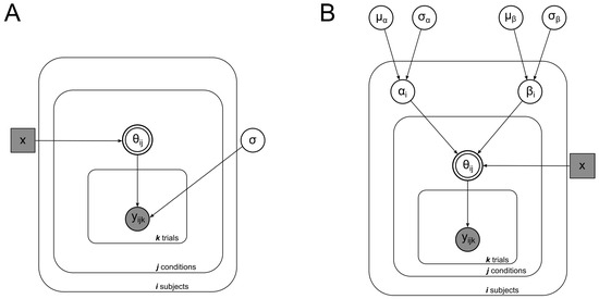 Bayesian graphical models illustrating the structure of Model 1 (left) and Model 2 (right). The basic structure is the same for both models: data for each subject i, in condition j, and on each trial k, are drawn from a Gaussian distribution centered around , which is a deterministic function of x, the magnitude of length change. (A) Model 1 essentially models subject response centered around a deterministic function (Equation (1)) with noise. (B) In Model 2, responses are centered around Equation (2), which added as free parameters, and , which represent the perceived start and end orientation of the object.