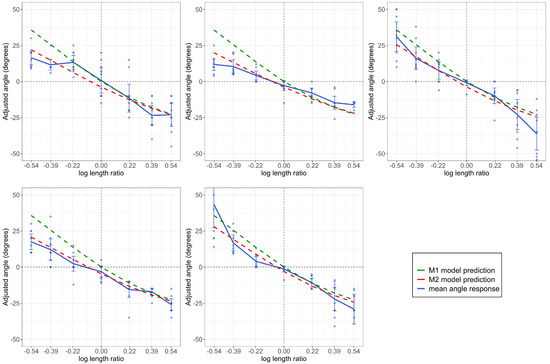 Each plot represents a different subject. The adjusted angle response is plotted as a function of the log length ratio. Each point represents a response to a trial. The mean of the angle responses is plotted as a blue solid line, while the model prediction is plotted as a dashed green line. The vertical reference line separates the decreasing length ratio (negative) from the increasing one. The horizontal reference line separates upward angle adjustments (negative) from downward (positive) ones.