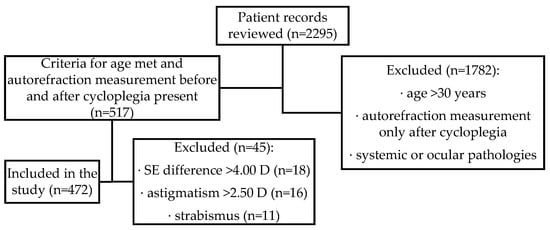 - Li, L.; Fu, J.; Chen, W.; Meng, Z.; Sun, Y.; Su, H.; Yao, Y.; Dai, W. Difference of refractive status before and after cycloplegic refraction: The Lhasa Childhood Eye Study. Jpn. J. Ophthalmol. 2021, 65, 526–536. [Google Scholar] [CrossRef]