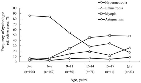 3.1. Frequency of Refractive Errors before and after Cycloplegia