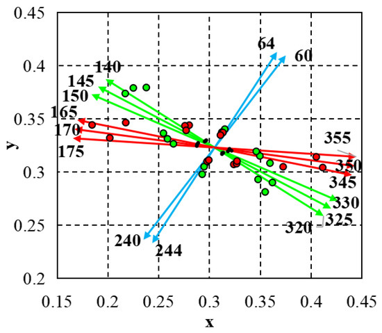 The CAD test is widely used in colour vision screening and research due to its ability to accurately assess chromatic resolution thresholds across various directions in colour space (Figure 1). This quality of CAD tests enables the monitoring of changes in colour vision over a person’s lifetime, as well as the identification of decreases in chromatic sensitivity due to eye and general diseases, or congenital colour vision deficiencies. The test was performed in a room with an illumination of 10 lux or less, under binocular viewing conditions at a distance of 1.40 m. Prior to the examination, the distance between the participant and the monitor displaying the CAD test stimuli was verified. To reduce potential human and machine errors, participants were instructed to indicate the direction of the stimulus motion by pressing a button on a remote only after the demonstration of the test stimuli had finished.