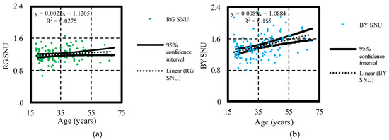 The findings of this study resulted in the exclusion of a few participants due to a significant decrease in chromatic sensitivity thresholds RG (n = 1), BY (n = 3), RG and BY (n = 1) on the CAD test according to norms suggested by the literature. Interestingly, these individuals exhibited changes solely on the CAD test and not with other colour vision tests. The participants’ performance on the CAD test during routine colour vision exams is determined by two parameters—RG and BY chromatic thresholds. Chromatic sensitivity thresholds RG and BY represent normalized chromatic sensitivity threshold values calculated in the colour directions corresponding to 67 and 334 degrees in the CIExy colour space [5]. In the colour direction BY, L and M cone excitation does not differ from L and M cone excitation by achromatic background, which enables the examination of S cone chromatic sensitivity thresholds. Conversely, in the RG colour direction, S cone excitation does not differ from S cone excitation by the achromatic background. This allows for the separate assessment of L and M cones, isolating their responses from those of the S cones. No statistically significant linear relationship was found between the age of study participants and chromatic sensitivity thresholds RG measured by the CAD test (). On the other hand, a statistically significant relationship between age and BY chromatic thresholds () was found. However, the linear regression model only accounts for 15.50% of the variability in BY chromatic sensitivity thresholds (Figure 2).