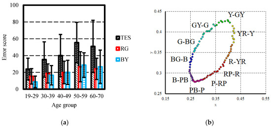 The FM100 hue test results of the study participants were analysed using the method proposed by Kinnear [27] to calculate the total error score (TES). Additionally, partial error scores for the RG and BY axes were calculated using the method proposed by Smith et al., 1985 [25]. The RG partial error score was determined by summing the error values for colour caps numbered 13–33 and 55–75, while the BY partial error score was calculated by summing the error values corresponding to the colour caps numbered 1–12, 34–54, and 76–85. When comparing the average values of the TES scores of study participants, statistically significant differences were found between the age group 19–29 (M = 23.96, SD = 12.98) and age groups 40–49 (M = 39.97, SD = 25.12), p = 0.013, and 50–59 (M = 55.40, SD = 24.14), p = 0.017. The results of the FM100 hue test indicate that the RG partial error score values do not differ significantly between age groups. However, the BY partial error score values differ significantly between the age group 19–29 (M = 8.67, SD = 6.89) and age groups 30–39 (M = 16.57, SD = 11.56), p = 0.013, 40–49 (M = 20.00, SD = 14.39), p = 0.001, and 50–59 (M = 28.70, SD = 14.62), p = 0.014 (Figure 3a).