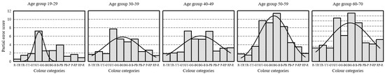 Upon comparing the partial error scores in individual colour categories (Figure 3b), it was found that there were no statistically significant differences in partial error scores between age groups in the colour categories R-YR, YR-Y, Y-GY, GY-G, PB-P, and P-RP. However, statistically significant differences were observed in partial error scores in the colour category BG-B between the age group 19–29 (M = 2.58, SD = 3.13) and age groups 40–49 (M = 5.24, SD = 3.89), p = 0.015, and 50–59 (M = 11.40, SD = 7.31), p = 0.029; in the colour category B-PB between the age group 19–29 (M = 3.92, SD = 3.51) and age groups 40–49 (M = 7.18, SD = 4.31), p = 0.006, and 50–59 (M = 8.30, SD = 3.43), p = 0.02. Also, significant differences were found in the colour category G-BG between age groups 19–29 (M = 2.54, SD = 3.11) and 40–49 (M = 5.30, SD = 4.50), p = 0.028; and in the colour category RP-R between age groups 19–29 (M = 0.92, SD = 1.78) and 40–49 (M = 3.24, SD = 3.83), p = 0.018. To examine age effect on colour resolution average partial error scores in individual colour categories within each age group were fitted with a Gaussian function using the Matlab “Curve fitting tool”. Analysis revealed a clear pattern in the number of errors made by participants across different colour categories. It was found that as participants’ ages increased, individuals tend to make more errors when arranging colour caps that correspond to colour categories BG-B, B-PB, G-BG, and RP-R. This finding is consistent with expectations, as the absorption of light in the short wavelength range significantly increases with age (Figure 4).