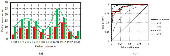 (a)—displays the partial error scores of individuals with red–green colour vision deficiency, protan (represented by red bars) and deutan (represented by green bars). (b)—illustrates the ROC function of the FM100 hue test.