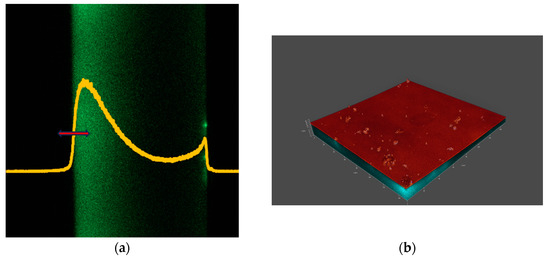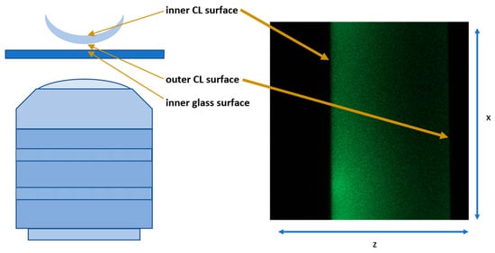 Microscopic measurements were performed using a Leica TCS SP8 confocal microscope in an inverted configuration. The contact lenses (CLs) were placed in a 35 mm glass-bottom dish. Each lens followed the same protocol: 50 µL of PBS was first added to the bottom of the container, and the lens was placed outer surface down in the solution. Then, 100 µL of the PBS–NBD–CHL incubation solution was added to the lens. The dish containing the lens was positioned on the microscope stage. The schematic of the configuration is shown in