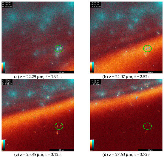 Figure 6 shows four frames from the video of a senofilcon A lens within a 5.34 µm space around the lens surface. The video illustrates that the lipid agglomerates permanently attach to the surface and remain immobile. The green circles highlight that agglomerates on senofilcon A lenses do not move. A correlation between the lipid deposits’ location on the surface and the fluorescence signal from the lens material is evident in the