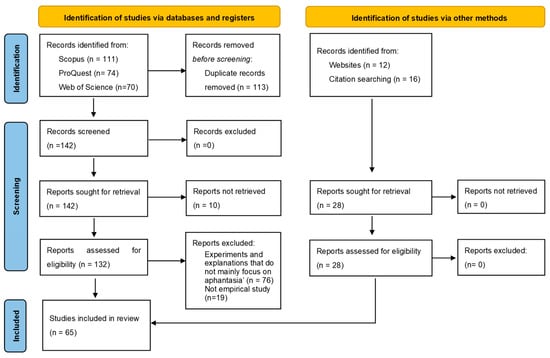This study undertook a systematic search of English-language articles published between 2015 and the present (Figure 1). The commencement year of 2015 was selected due to its significance as the year in which Zeman et al. first coined the term “aphantasia” to characterize the absence and marked reduction of visual imagery. The databases used include Scopus, PubMed, ProQuest, and Web of Science. All the relevant journal articles, master’s and doctoral theses, conference papers, and preprints were included in the search. As of 14 August 2024, an initial retrieval yielded 255 literature sources, from which 113 duplicates were removed. Other screening methods and a careful examination of the references cited in pertinent articles added 28 more literature sources to the pool. An in-depth review of titles, abstracts, and full texts for these 170 literature sources led to the exclusion of 10 inaccessible papers, 76 papers not centrally concerned with aphantasia, and 19 non-empirical studies, finally resulting in a curated collection of 65 pertinent literature sources.