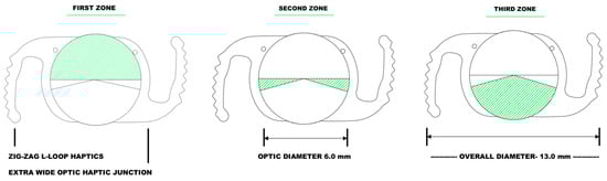 The Spirant AutofocusPro (Model No VVB10SCA by Lifeline Medical Devices Pvt.Ltd, Shendra, Aurangabad, India) intraocular lens with a power of 21.0 D was evaluated. It is a recently launched single-piece, hydrophobic, acrylic intraocular lens with an optical diameter of 6.0 mm and an overall diameter of 13.0 mm. According to the manufacturer’s specifications, the lens is made of a UV-absorbing material with a refractive index of 1.49 and an Abbe number of 43. The material of the IOL is produced by Contamac Ltd., Saffron Walden, United Kingdom. The lens has a 360° square edge design and is available in a power range of +3.0 D to +40.0 D. It has a theoretical A-constant of 118.5 and suggested A-constant (SRK/T 118.7, BARRETT’S LF 1.73). The oval-shaped optic aims to cover a larger area of the visual field, especially the temporal field of vision when the lens is placed horizontally. However, the recommended clear corneal incision size is 2.6 mm due to its special design. The lens is equipped with a novel, special haptic design (“zig-zag L-loop”) to provide (regarding the manufacturer’s claims) higher friction and solid rotational stability due to the high contact with the capsule. The anterior side of the optic is divided into 3 zones (Figure 1). The first zone (180–210°) for far distance, the second zone (5–15°) for intermediate distance, and the third zone (110–155°) for near distance. The diopter range for the second zone is (add +1.5 to 2.0 D). The posterior side of the lens has an aspheric design with a single zone.