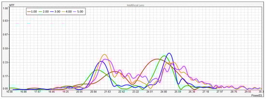 The pink line, representing the largest aperture (5.00 mm), demonstrates the best overall performance, with multiple prominent peaks and the highest MTF values. The sharpest focus occurs at around 23.22 D, where the MTF value reaches 0.6, suggesting strong contrast transfer. This aperture performs well across a broader range of defocus powers compared to the others, with significant peaks between 22.42 D and 24.01 D. The lens’s optical performance at this aperture suggests that it is particularly effective at providing multifocal capabilities, delivering sharp focus over a broad range of powers.
