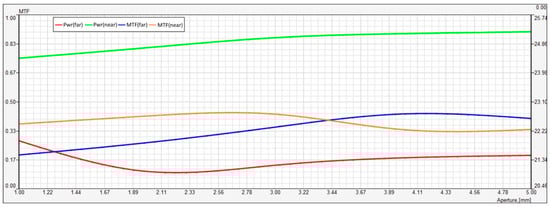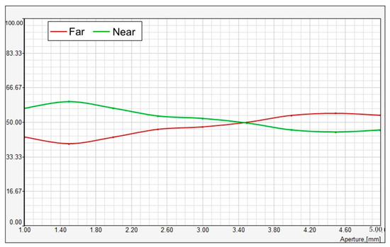 The orange line represents the MTF for near vision. The MTF remains relatively stable across the aperture sizes, starting around 0.34 at 1.00 mm and showing a slight increase, reaching about 0.37 at 5.00 mm. This indicates that the lens’s ability to transfer contrast for near vision remains consistent and improves slightly as the aperture size increases. However, it seems that it does not change drastically across the range.