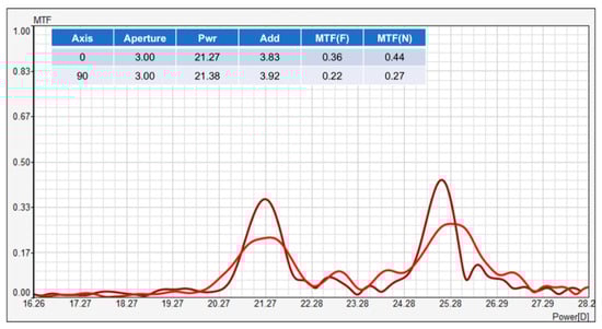 The darker red curve represents the MTF along the 0° axis. For this meridian, the MTF has a prominent peak at approximately 21.27 D, corresponding to far vision. Another noticeable peak appears at around 25.28 D, which corresponds to near vision. These peaks demonstrate the bifocal design’s ability to focus on two distinct distances—far and near—as intended by the lens design.