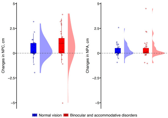Considering individual variations, a reduced near point of convergence following VR gameplay was more common among individuals with binocular and accommodative disorders than in the control group (64% vs. 46%). On average, the near point of convergence changed by 1.8 ± 1.1 cm in the group with binocular and accommodative disorders, and by 1.3 ± 0.7 cm in the control group. However, a reduced near point of accommodation occurred with similar frequency in both groups (36% vs. 42%), with the mean changes being 1.3 ± 1.2 cm in the group with binocular and accommodative disorders and 0.9 ± 0.6 cm in the control group. Overall, larger changes were observed in the near point of convergence compared to those in the near point of accommodation.