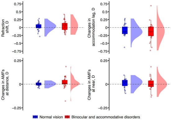 Considering individual variations, the majority of participants (69% in the control group and 67% in the group with binocular and accommodative disorders) exhibited a decrease in accommodation lag, indicating a stronger accommodation response to stimuli at a distance of 33 cm. This change was −0.22 ± 0.18 D in the control group and −0.26 ± 0.18 D in the group with binocular and accommodative disorders. Interestingly, a hyperopic shift in refraction was the most prevalent response—approximately half of the participants (46% in the control group and 55% in the group with binocular and accommodative disorders) had it, suggesting a more relaxed accommodation response to distant stimuli compared to the baseline (0.15 ± 0.11 D in the control group and 0.18 ± 0.10 D in the group with binocular and accommodative disorders). Meanwhile, 23% of participants in the control group and 27% of those with binocular and accommodative disorders showed a myopic shift in refraction following VR gameplay (−0.14 ± 0.08 D in the control group and −0.13 ± 0.06 D in the group with binocular and accommodative disorders).