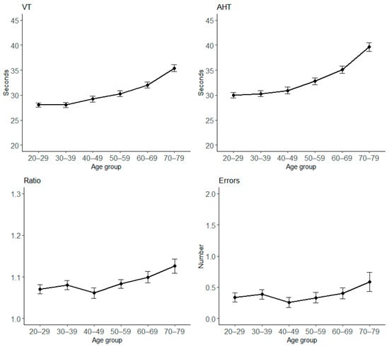 Mean scores among age groups for all DEM subtests separately. VT = Vertical Time; AHT = Adjusted Horizontal Time. Bars represent ± 1 SEM.