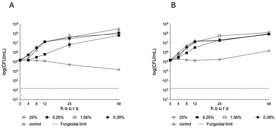 In Figure 1A, a typical concentration-dependent activity can be seen. Indeed, the control values (0% concentration) are lower compared to the treated cell counts. However, these facts could be observed at the lowest concentrations tested. These strange patterns, especially at lower concentrations, are relatively common in the case of time-kill experiments, particularly with agents showing static and not cytocidal effects.