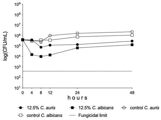 A significant decrease was observed in the living cell number of C. albicans and C. auris between 0 and 24 h in the presence of 12.5% Oftasecur® dilution (p < 0.01–0.001) (Figure 2).