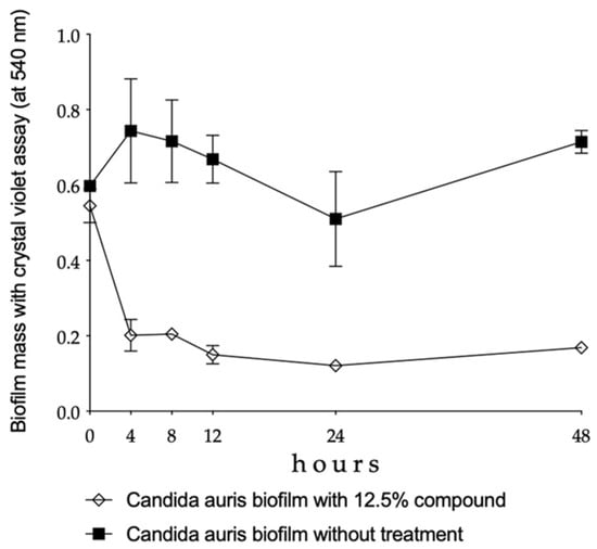 A significant reduction was observed in the biofilm mass of C. auris between 4 and 48 h of being in the presence of the 12.5% Oftasecur® dilution (p < 0.01–0.001) (Figure 3).