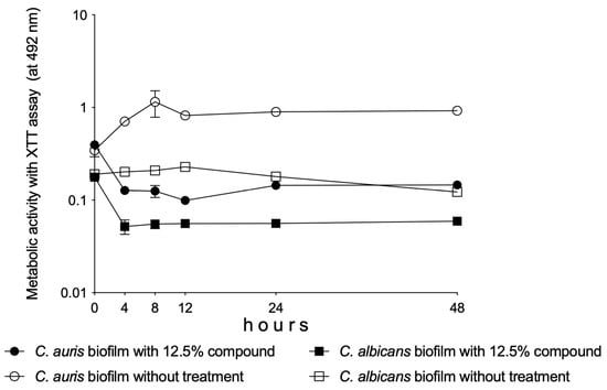 A significant reduction was observed in the metabolic activity of C. albicans and C. auris biofilms between 4 and 48 h of being in the presence of the 12.5% Oftasecur® dilution (p < 0.05–0.001) (Figure 4).