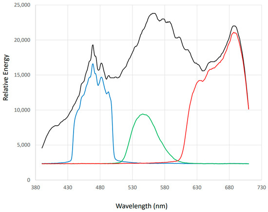 Figure 2 displays the spectral graphs for the light source, including the Xenon white, short-wave, medium-wave, and long-wave filter measurements. An LED light meter was utilized to confirm that light levels remained consistent across all conditions. The light meter was positioned at eye level during measurements, ensuring that the recorded energy levels were uniform across conditions (M = 87 lux).