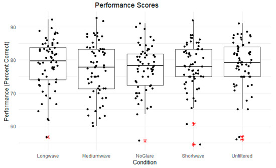 A series of paired-sample t-tests were performed to investigate pairwise differences between the no glare and filtered conditions for both performance scores and LTM thresholds. No significant differences in performance scores were found between the no glare condition and any of the filter conditions: no glare/unfiltered (t = −1.24, p = 0.22), no glare/short-wave (t = −0.55, p = 0.58), no glare/medium-wave (t = 0.35, p = 0.73), no glare/long-wave (t = −1.0, p = 0.32).