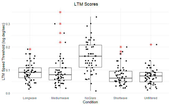 Similarly, another one-way, within-subjects ANOVA was used to evaluate the influence of spectral filtering on LTM speed thresholds across the same conditions. The results indicated no significant effect of the lighting conditions on LTM speed thresholds, F(4, 236) = 0.63, p = 0.61. The means and standard deviations for each filter condition were as follows: long-wave (M = 0.16, SD = 0.37), medium-wave (M = 0.11, SD = 0.11), no glare (M = 0.21, SD = 0.18), short-wave (M = 0.24, SD = 1.08), unfiltered (M = 0.21, SD = 0.69).