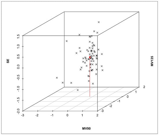 A trivariate analysis and a 3D plot assessed the relationships among SE, MV90, and MV135 and their influence on differences between the right-eye refraction values obtained under cycloplegia using ClickCheckTM and SCR. The red dot indicates the mean value and the red line indicates its projection on the plane MV90 versus MV135.
