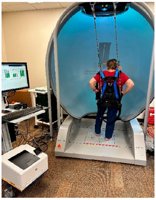 A full-body safety harness system, secured to an overhead bar, was worn by subjects to prevent fall injuries [4,6,49,50]. The subjects stood on the Bertec Balance Advantage® system for Computerized Dynamic Posturography with Immersion Virtual Reality (CDP-IVR) with their feet positioned comfortably apart. The CDP-IVR allowed for the measurement of balance performance and the monitoring of postural stability improvements. The one-leg standing test was conducted by the system to assess postural stability under two different visual conditions: eyes open and eyes closed. The order of these conditions was randomized to minimize potential learning effects and bias. Each standardized procedure was demonstrated to the subjects before testing. Initially, subjects were asked to stand steadily on their dominant foot for 10 s on the balance plate with their eyes open. Upon instruction, the subject stood upright on the force plate with the contralateral hip and knee flexed to approximately 30 degrees. Subjects were instructed to place their hands on their hips to eliminate upper-limb contributions to balance, thereby isolating lower-limb and core postural control mechanisms.