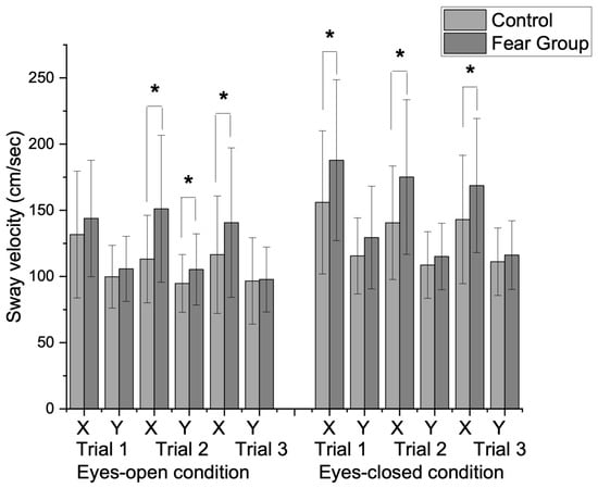Group differences in sway velocity changes between eyes-open and eyes-closed conditions during repeated one-leg standing trials. A significant group interaction was observed for visual condition (F = 7.43, p = 0.01). In the eyes-open condition, there were significant differences in sway velocity in the ML direction during the second trial (t = −3.95, p = 0.01) and the third trial (t = −2.09, p = 0.02). The AP direction also showed significant differences during the second trial (t = −1.96, p = 0.03). In the eyes-closed condition, the fear group demonstrated significantly higher sway velocities in the AP direction across all trials during the first trial (t = −2.31, p = 0.01), second trial (t = −3.09, p = 0.001), and third trial (t = −2.05, p = 0.02). (X: mediolateral direction (ML), Y: anteroposterior direction (AP), * p < 0.05).