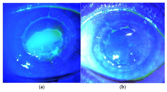Figure 1. Phase I study—safety of locally delivered allogeneic mesenchymal stem cells for promoting corneal repair: (a) PCED size at baseline was 5.7 × 4.4 mm2; (b) complete resolution of PCEDs on Day 90.