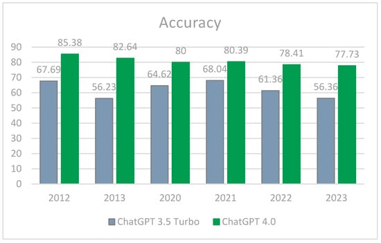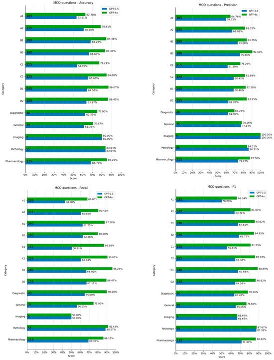 After dividing all answers to MCQ questions in a 2 × 2 contingency table, we found a statistically significant difference in observed proportions vs. expected values for ChatGPT-3.5 Turbo and 4o (p < 0.001). ChatGPT-4o results were superior to 3.5 Turbo results across all metrics (80.40% vs. 63.18% accuracy, 84.62 vs. 60.97% recall, 80.77% vs. 68.76% precision, and 82.65% vs. 64.63% F1 score, respectively). ChatGPT-3.5 Turbo’s accuracy metrics did not change significantly, even after sitting several exams (R-squared values: 0.145 accuracy, 0.21 precision, 0.13 recall, and 0.16 F1), while ChatGPT-4o’s metrics decreased with each paper (R-squared values: 0.90 accuracy, 0.90 precision, 0.91 recall, and 0.96 F1) (Figure 1).