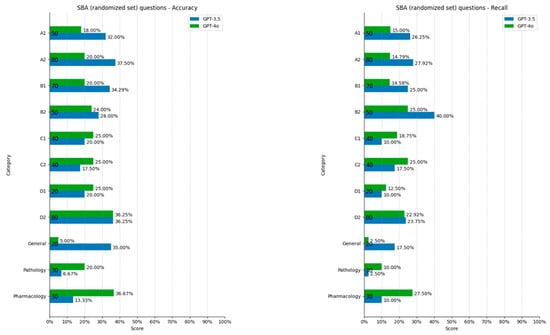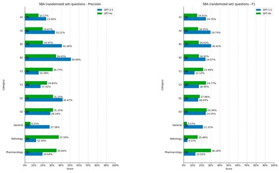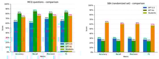 ChatGPT 3.5-Turbo’s metrics were higher than those of ChatGPT-4o when answering SBA questions (28.43% vs. 24.12% accuracy, 28.94% vs. 24.13% recall, 29.36% vs. 24.42% precision and 26.97% vs. 23.51% F1 respectively).