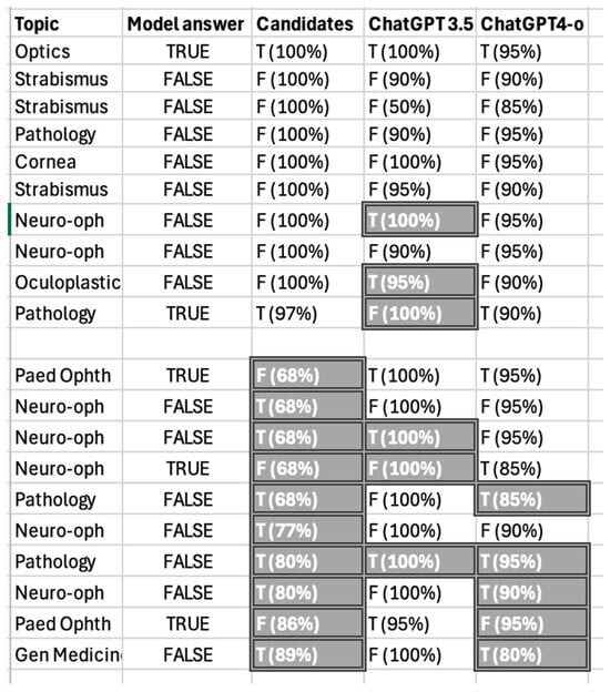 - Taloni, A.; Borselli, M.; Scarsi, V.; Rossi, C.; Coco, G.; Scorcia, V.; Giannaccare, G. Comparative performance of humans versus GPT-4.0 and GPT-3.5 in the self-assessment program of American Academy of Ophthalmology. Sci. Rep. 2023, 13, 18562. [Google Scholar] [CrossRef]