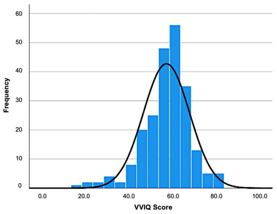 The initial sample size consisted of N = 226 participants who completed measurement 1. Of those, N = 158 participants completed measurement 2. Participants were recruited by advertisement on university websites, social media, and word-of-mouth advertising. Inclusion criteria were legal age and reachability via e-mail. Among the sample, 3 participants were classified as aphantasics (VVIQ < 23; according to [48]) and 9 were classified as hyperphantasics (VVIQ > 75; [48]). The remaining participants reached a mean score on the VVIQ of M = 57.12 (SD = 10.55). The VVIQ sum scores followed a normal distribution (see Figure 1). The age ranged from 18 to 59 years (M = 25.51; SD = 8.46). The sample was composed of 186 females (82.3%), 39 males (17.3%) and 1 participant of another gender (0.4%). The level of education was generally high (7% secondary school, 70.4% A-levels, 21.2% university degree, 0.4% doctoral degree, and 0.9% other).