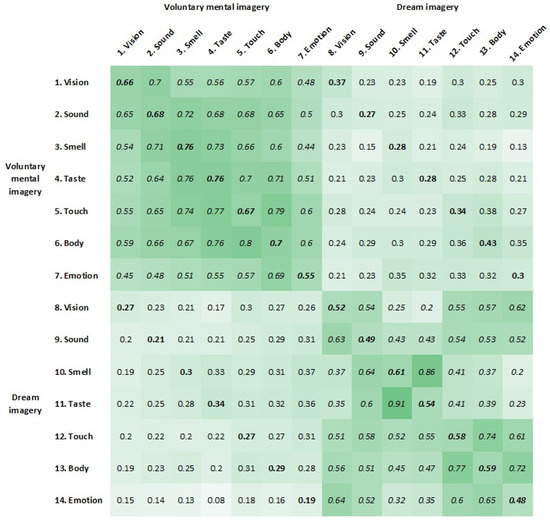 Unless otherwise stated, analyses were conducted using SPSS (Version 27.0) [79]. Retest reliabilities and intercorrelations between the vividness of different sensory modalities within and between voluntary mental imagery and dream imagery were assessed via Pearson’s correlations and presented in a heat map reflecting a multisense–multidomain matrix following conventional multitrait–multimethod matrices. The term “sense” is used to denote the sensory modality and “domain” refers to voluntary mental imagery or dream imagery. For correlation comparisons, correlations were mean-aggregated into monosense–monodomain correlations (i.e., averaging retest correlations within voluntary mental imagery and within dream imagery), monosense–multidomain correlations (i.e., averaging correlations of single sensory modalities across voluntary mental imagery and dream imagery), multisense–monodomain correlations (i.e., averaging correlations across sensory modalities within voluntary mental imagery and within dream imagery), and multisense–multidomain correlations (i.e., averaging correlations across sensory modalities across voluntary mental imagery and dream imagery) using Fisher’s z-transformations, before being compared with each other using the online tool Psychometrica [80]. An additional network analysis was performed using JASP 0.16.2 [81] to assess the sparsity of the total model, as well as for voluntary mental imagery and dream imagery separately. A sparse network has fewer links than a denser network. Thus, a higher sparsity for the total model than for both individual models would indicate two separate networks. Additional correlation comparisons between dream recall and lucid dreaming subgroups were calculated to assess moderation effects. Paired t-tests were calculated to assess differences in the vividness of multisensory imagery between voluntary mental imagery and dream imagery. To cross-validate our results, all analyses were performed separately for both measurement times. Due to the larger sample size, only the analyses for measurement time 1 are reported in the main text (with the exception of the intercorrelations in Figure 2 to assess retest reliabilities), whereas the analyses for measurement time 2 can be found in the Supplementary Materials. Deviations between the two measurement times are highlighted.