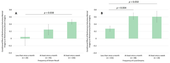Conditional effects of multisensory voluntary mental imagery vividness on multisensory dream imagery vividness by (A) the frequency of dream recall and (B) frequency of lucid dreams.