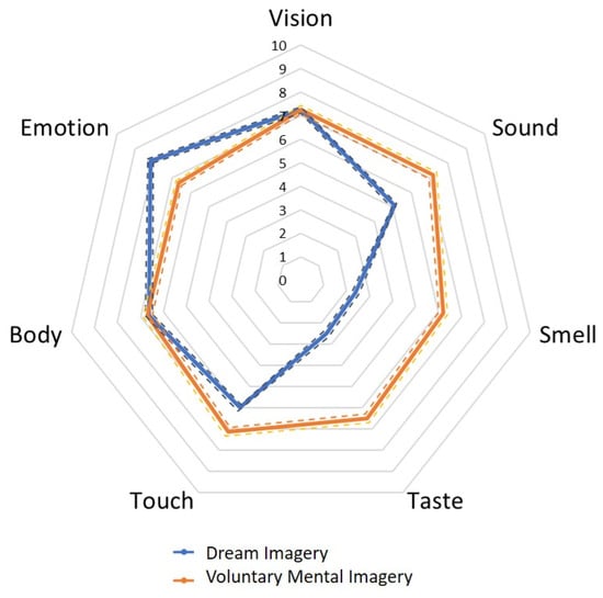 Dream imagery is also multisensory in nature. Ref. [33] gives an overview of various studies of the predominant sensory modalities in dreams. Visual impressions were most common (100%), followed by auditory impressions (65%). In contrast, only 1% reported experiencing gustatory, olfactory, or tactile sensations [34]. A review [35] presents predominantly visual imagery, followed by frequent auditory impressions and less frequent gustatory, olfactory, vestibular, and tactile impressions. A study by [36] found less frequent reports of gustatory, olfactory, and tactile experiences than reports of visual, auditory, and kinaesthetic modalities. The subjects were thus divided into three groups: firstly, participants who reported experiencing mainly visual, auditory, and kinaesthetic imagery; secondly, a group who experienced multisensory imagery; and thirdly, a group who reported no sensory experience at all. The group with multisensory dream imagery also showed the highest ability to generate voluntary mental imagery while being awake, suggesting a common cognitive mechanism. Importantly, many of the aforementioned studies measured the frequency of various sensory experiences in dream imagery, whereas the vividness of dream imagery was less examined. We aim to explore the vividness of dream imagery to make it more comparable to the phenomenology of voluntary imagery.